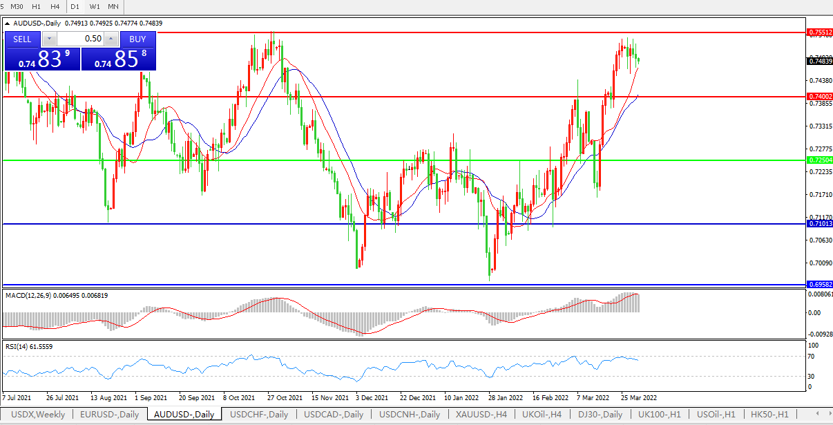 技术面简析:日图均线呈多头排列,汇价连续拉升后回落整理,MACD运行于0轴上且量能小幅缩量,RSI小幅走弱,预计汇价大概率将在整理后进一步上行。