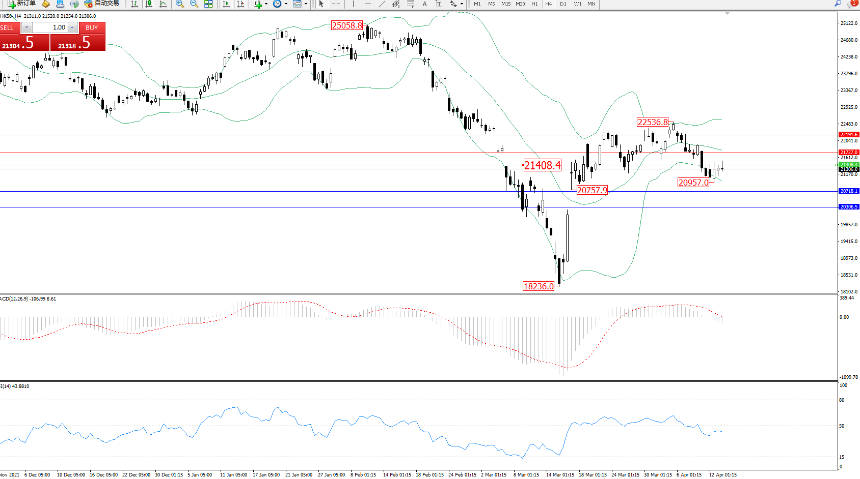 恒指HK50 ——4小时K线图显示: