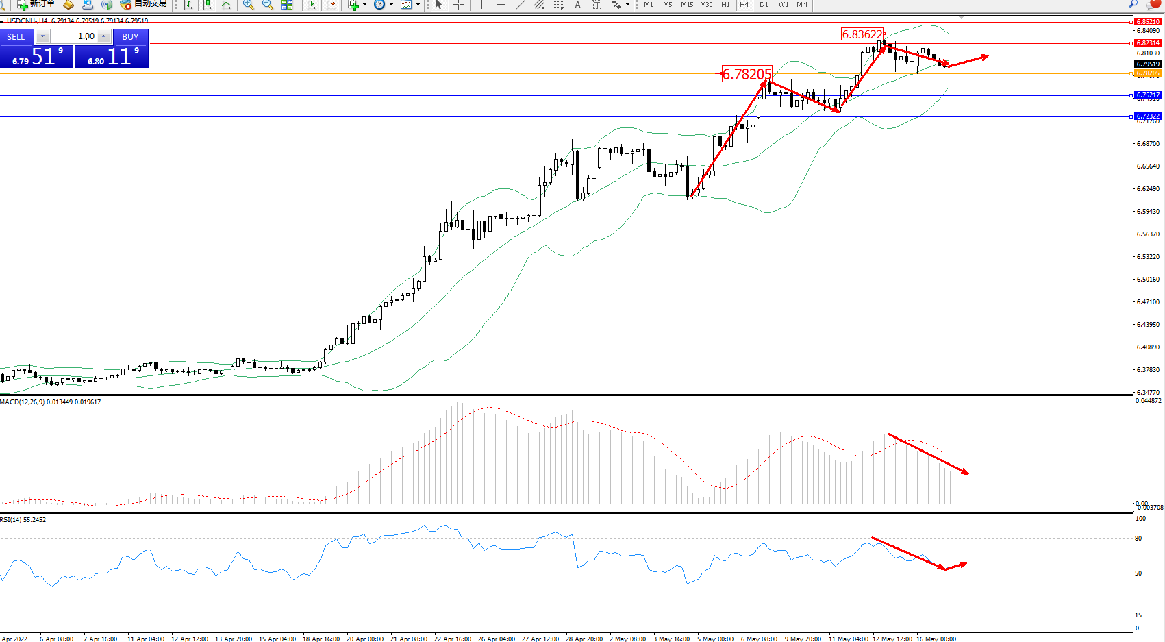 交易策略:6.78205上方看涨,目标6.82314、6.85210