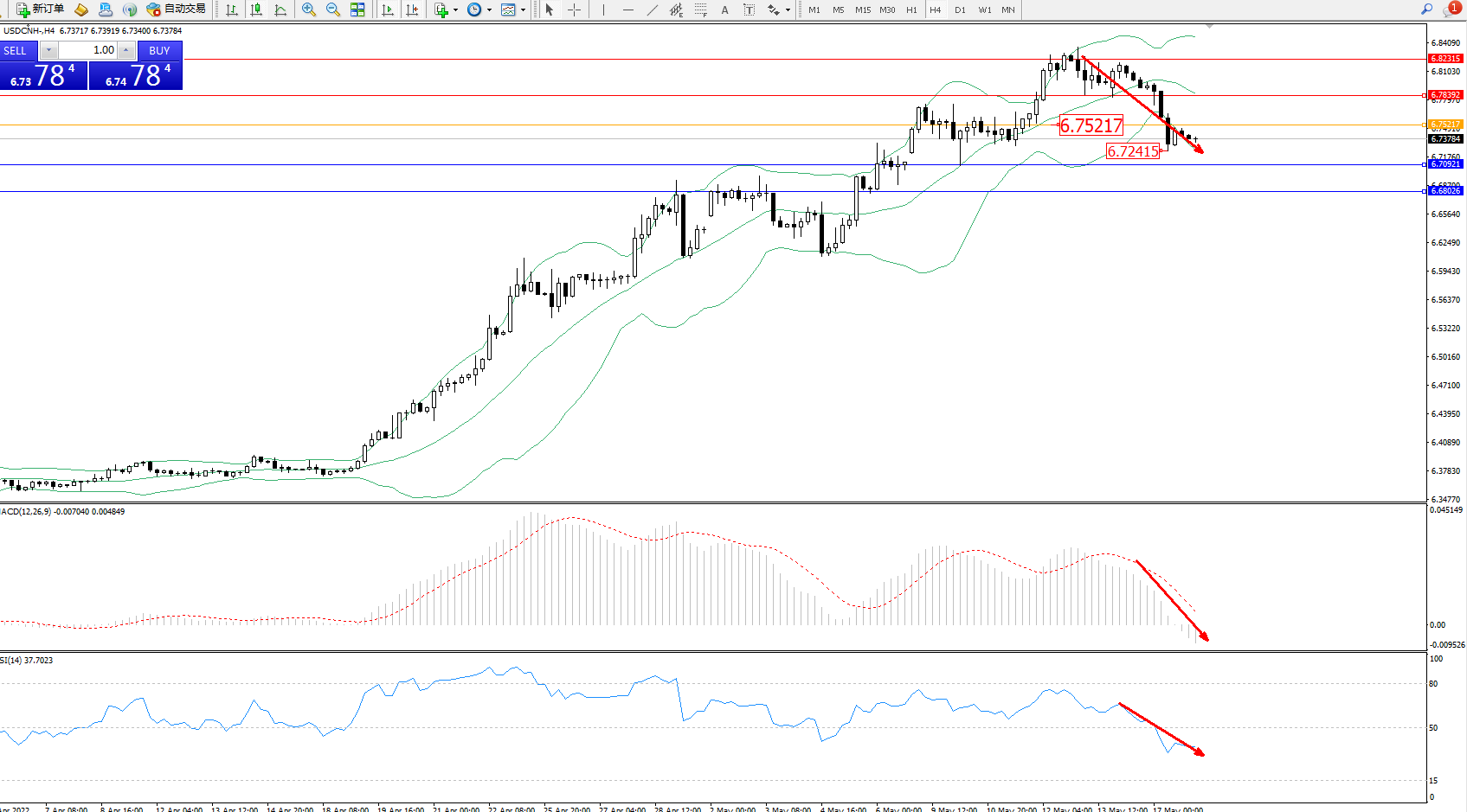 交易策略:6.75217下方看跌,目标:6.70921、6.68026