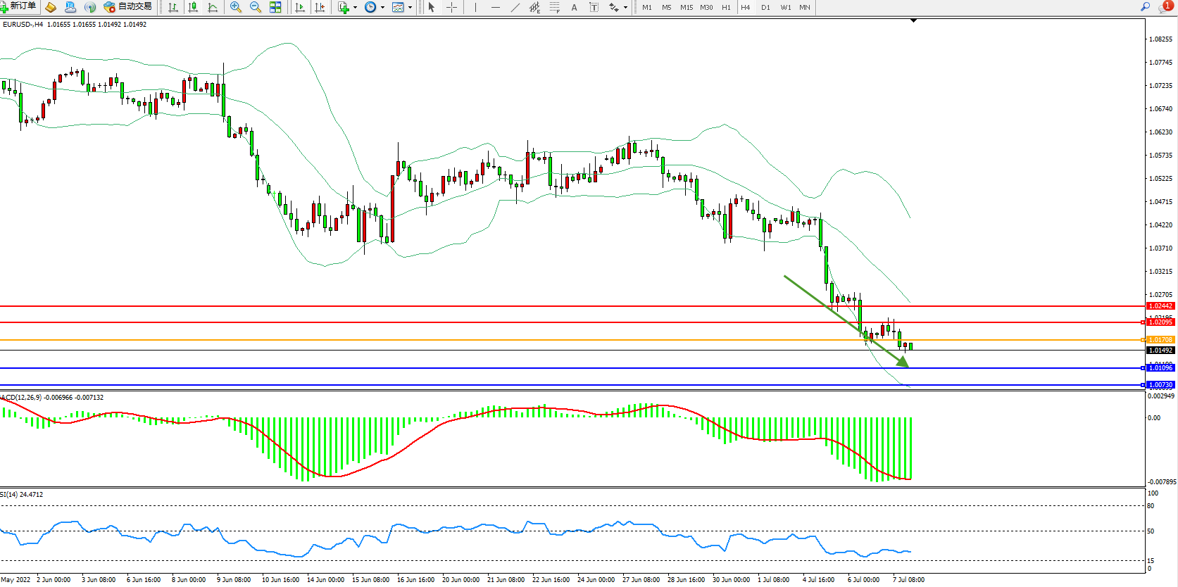 欧元美元EURUSD—4小时K线图显示: