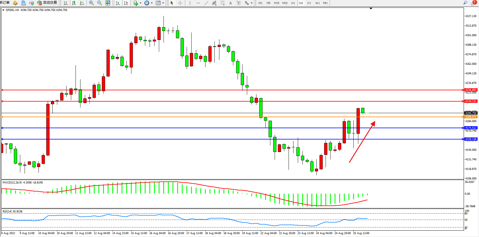 标普SP500——4小时K线图显示: