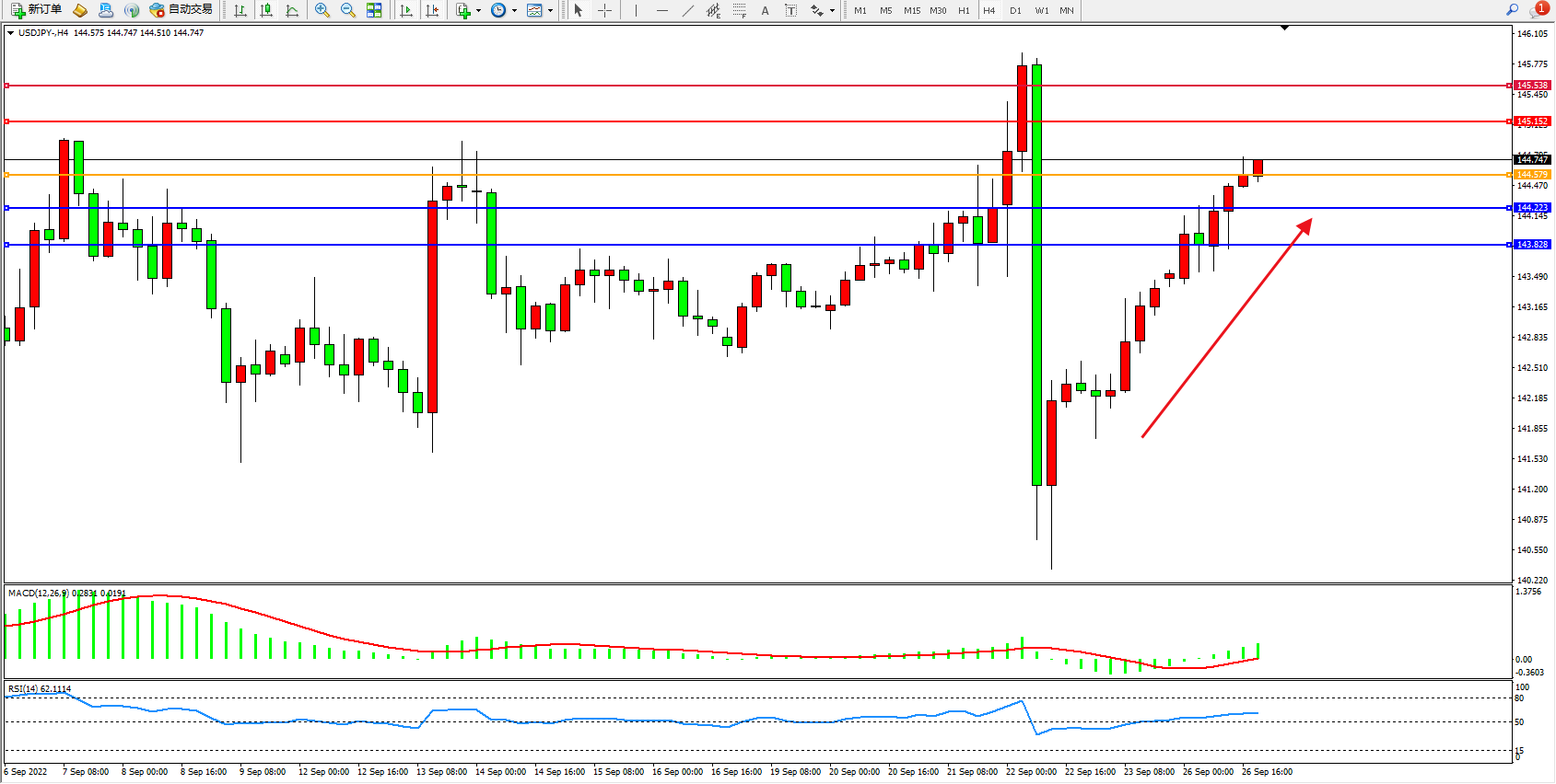 交易策略:144.579上方看涨,目标145.152、145.538
