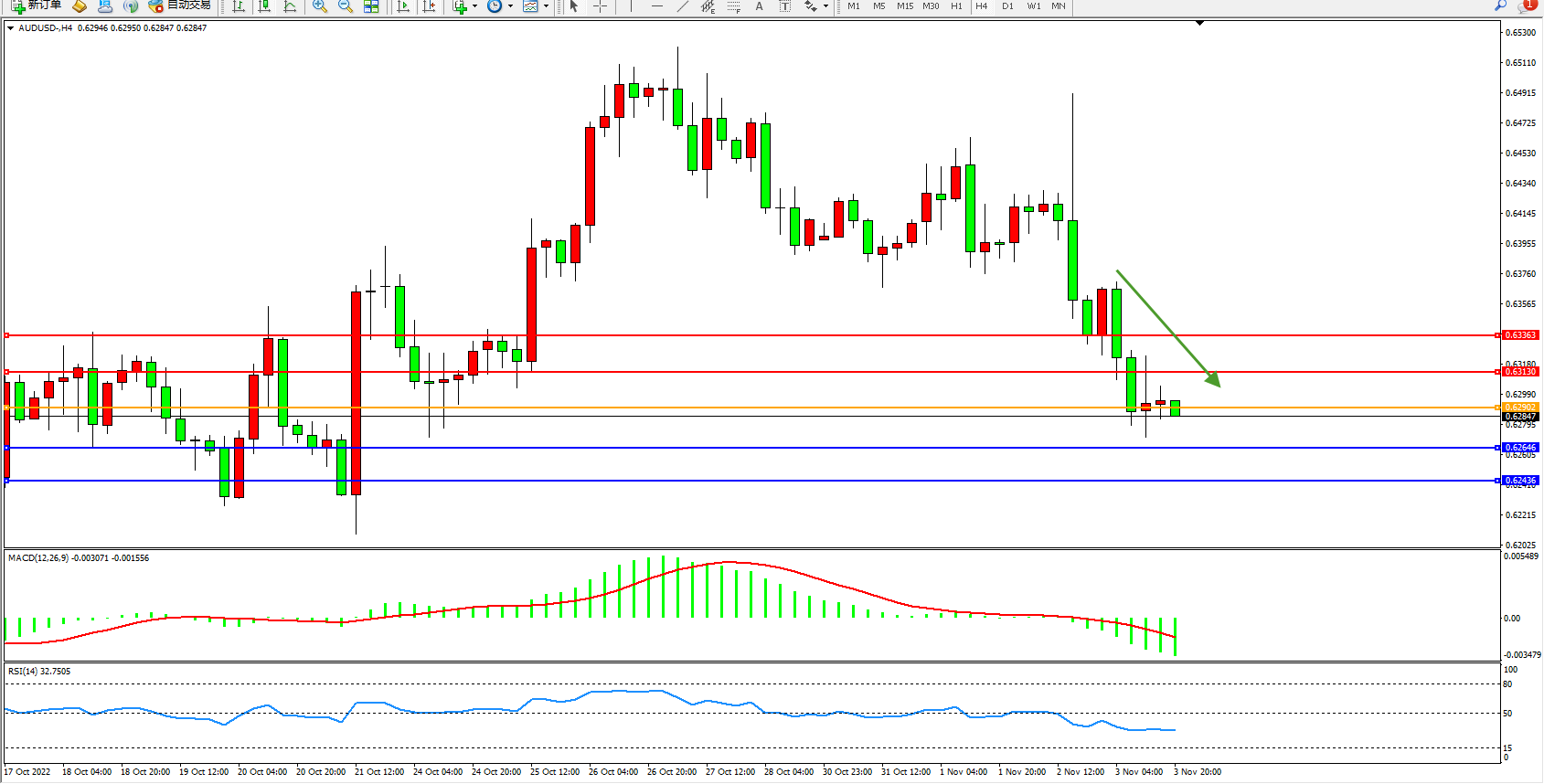 交易策略:0.62902下方看跌,目标0.62646、0.62436