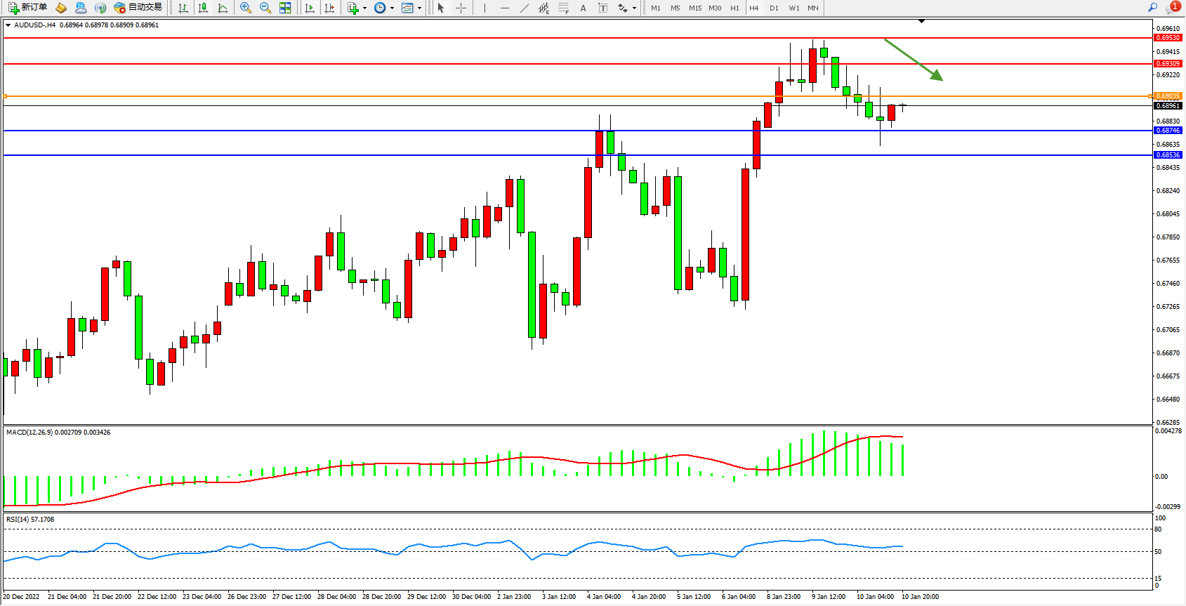 备选策略:0.69035上方看涨,目标0.69309、0.69530