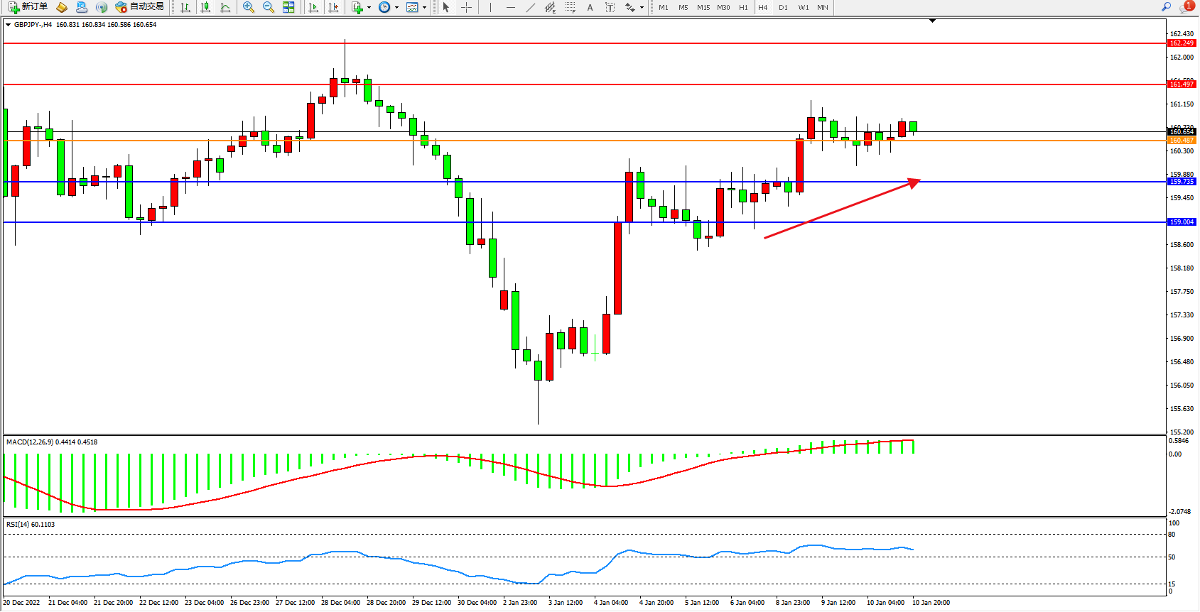 交易策略:160.487上方看涨,目标161.497、162.249