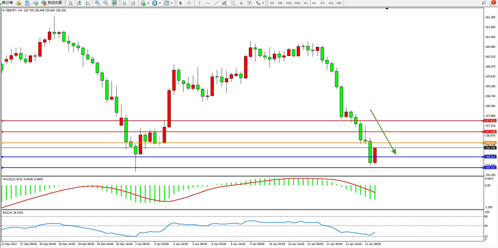交易策略:156.643下方看跌,目标156.013、155.531