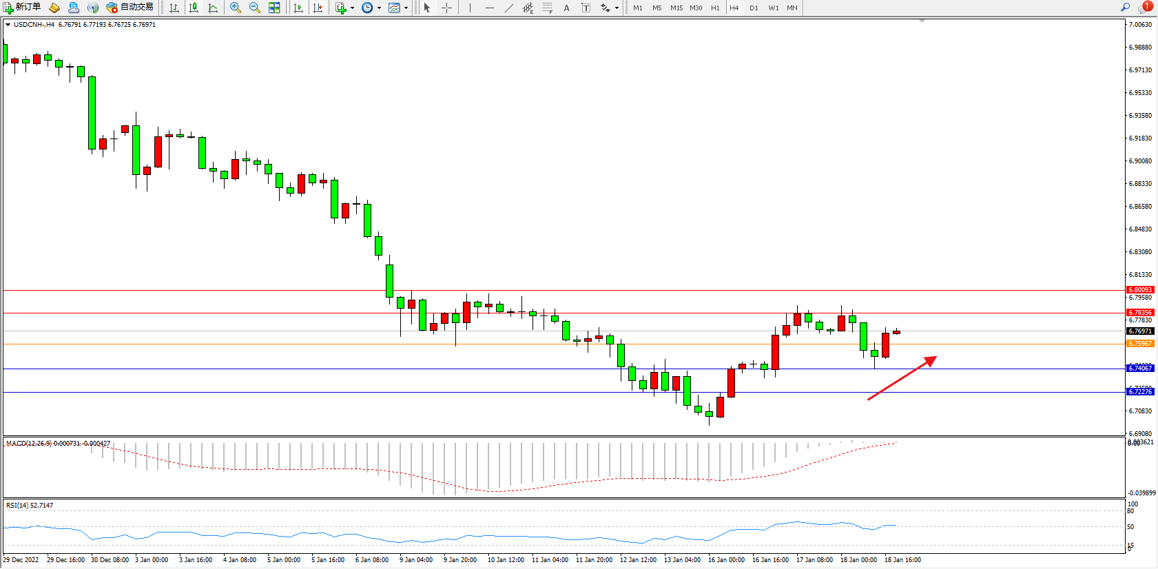 交易策略:6.75967上方看涨,目标6.78356、6.80093
