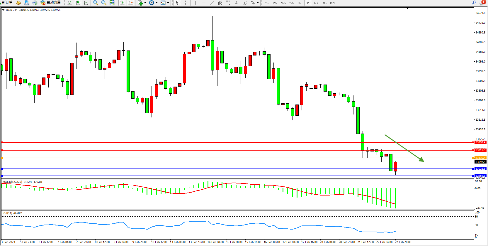 道琼斯指数2月22日(周三)收盘下跌83.26点,跌幅0.25%,报33046.33点;美联储会议纪要:“少数”官员支持或可能支持加息50个基点。美联储认为上行通胀风险是影响前景的关键因素。
