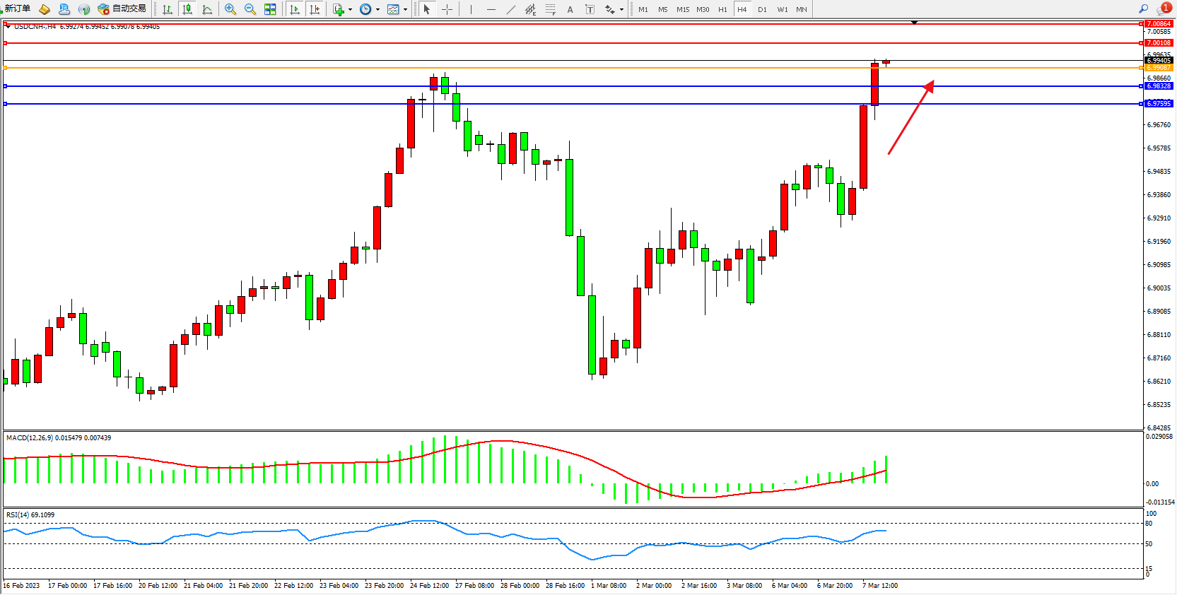 交易策略:6.99087上方看涨,目标7.00108  7.00864