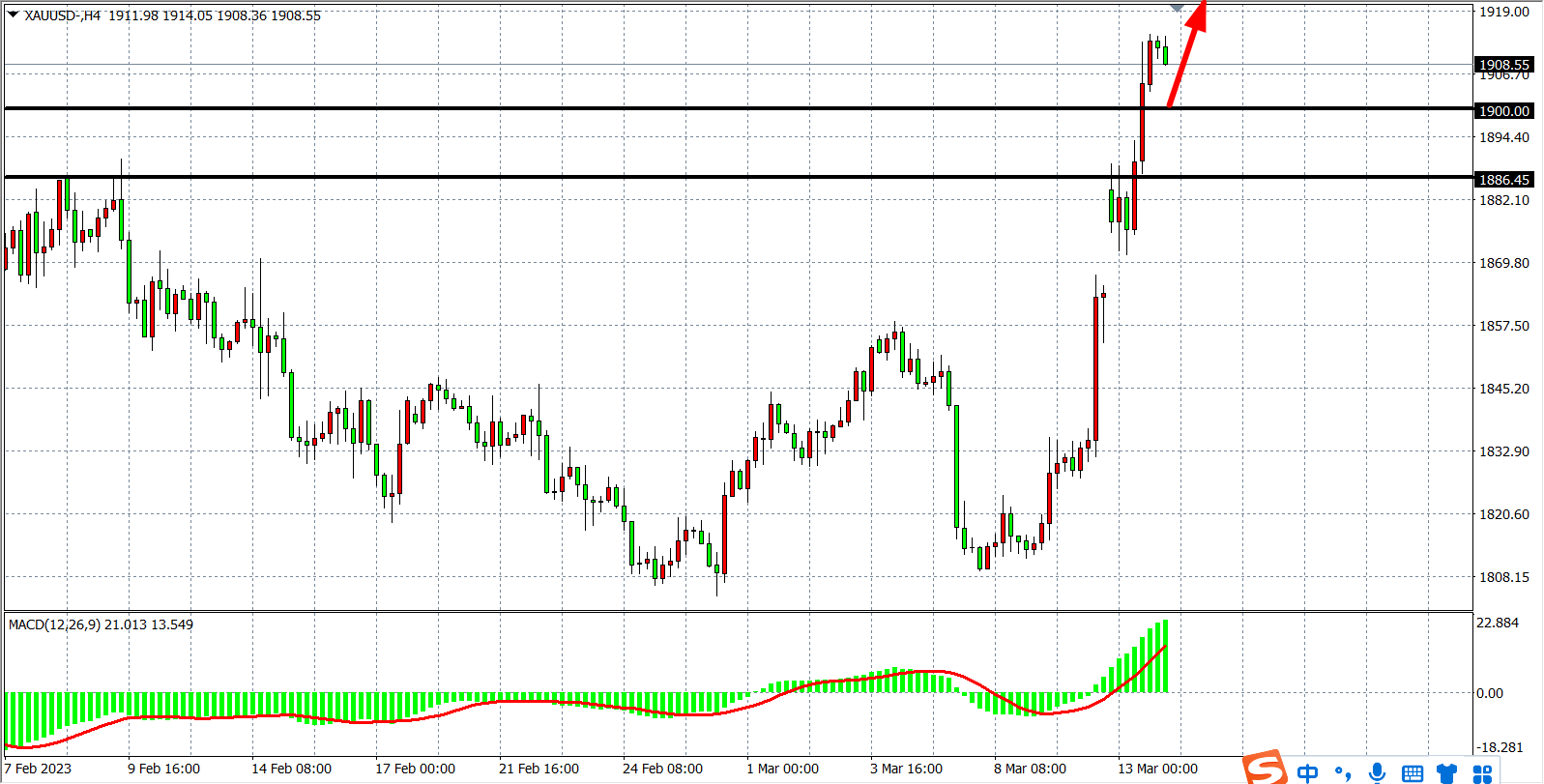 4小时图看,金价连破关键阻力,多头势如破竹,当前强支撑在于1886附近,同时短支撑关注1900一线,MACD在零轴之上继放量显示行情有进一步走高空间,日内关注1900支撑,在该位之上看涨1920-1950。