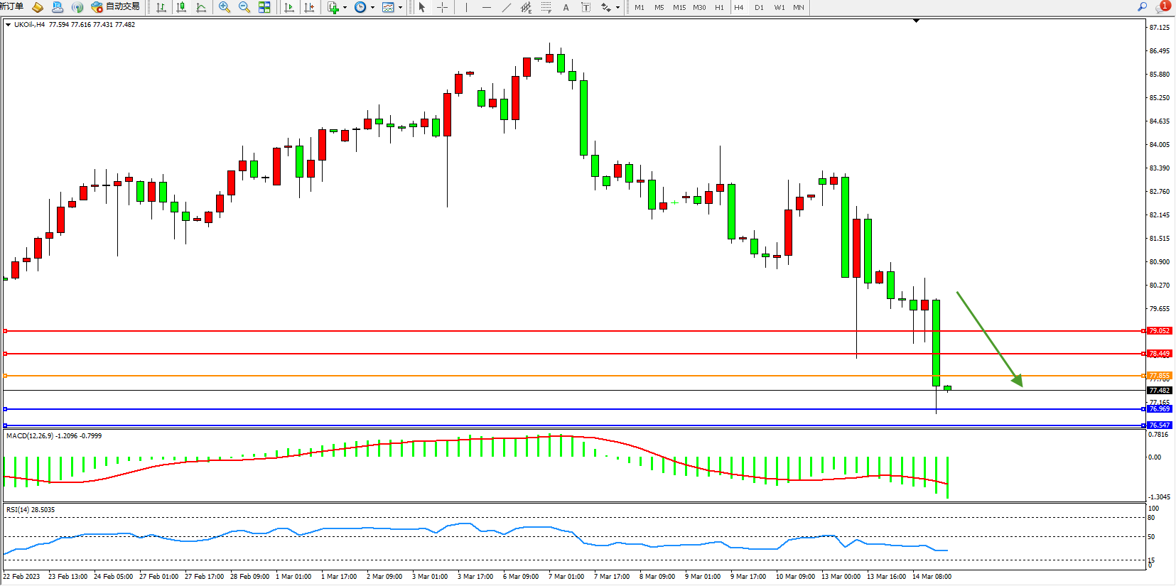交易策略:77.855下方看跌,目标76.969  76.547