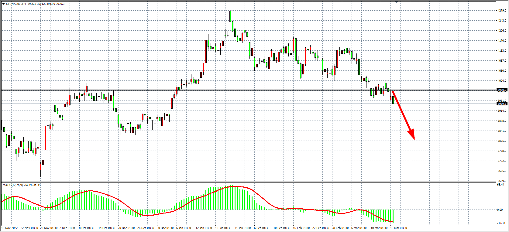 4小时图看,沪深300在4010之下继续走弱,压力再度显现,同时MACD于零轴之下量能依旧较大,显示空头动能仍强劲,阻力当前下移至3990,日内在3990之下继续看跌,下方目标3900-3850附近。
