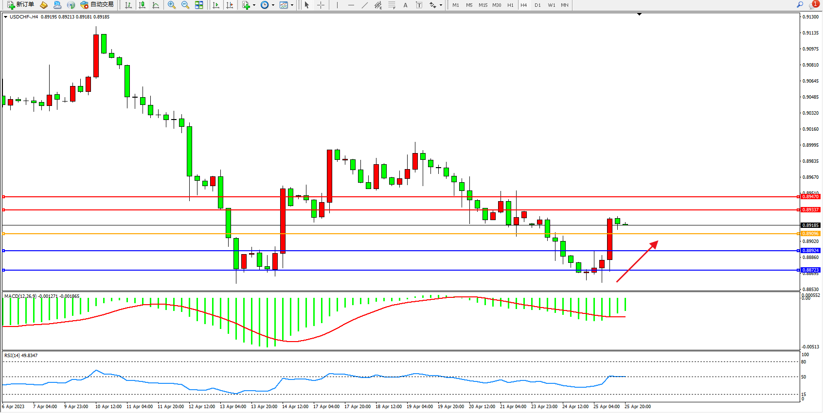 美元瑞郎USDCHF——4小时K线图显示: