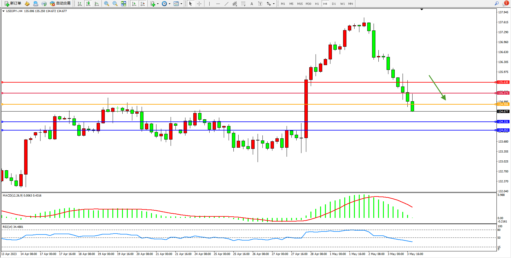 交易策略:134.906下方看跌,目标134.331 134.053
