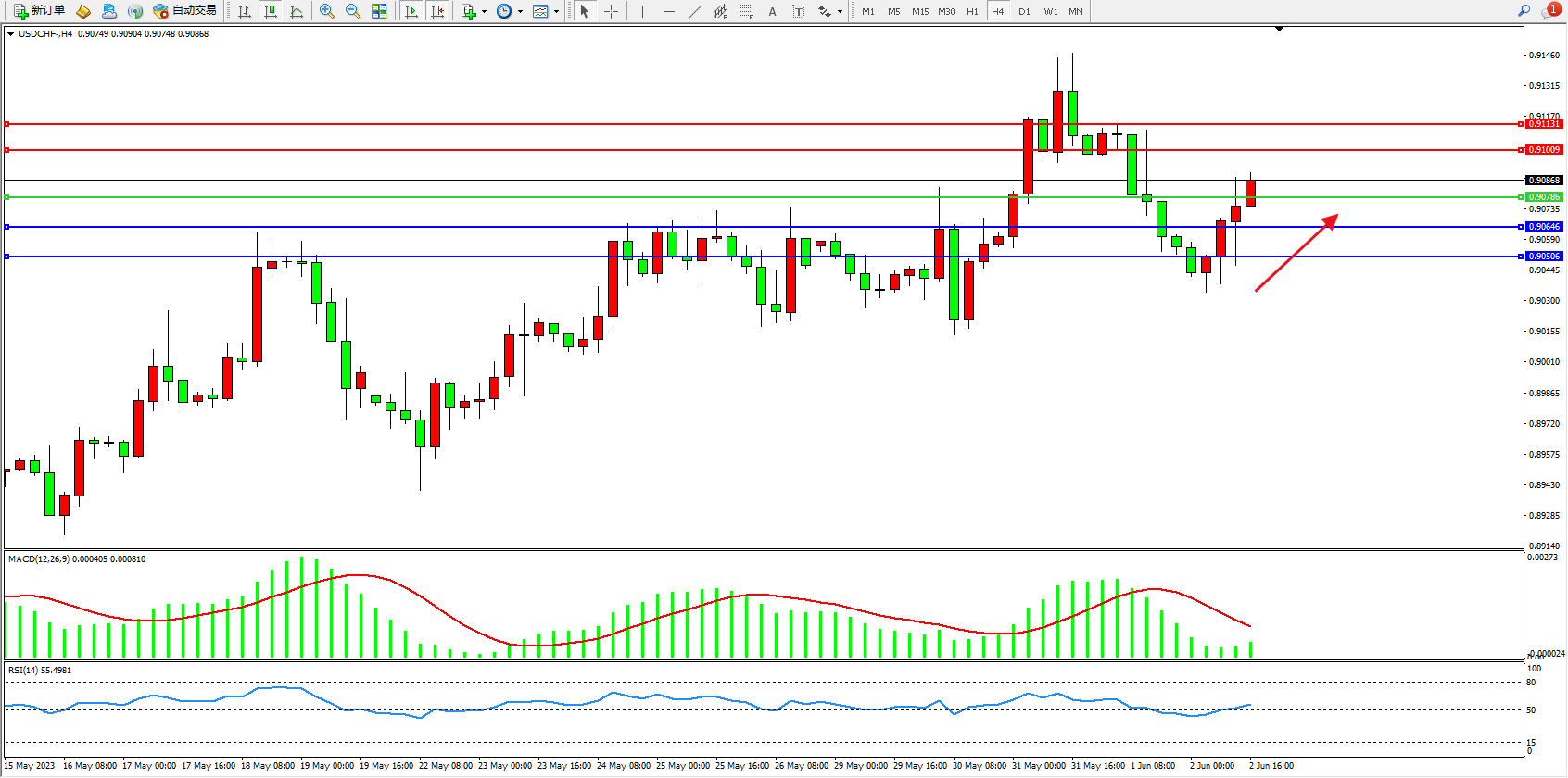 美元瑞郎USDCHF——4小时K线图显示: