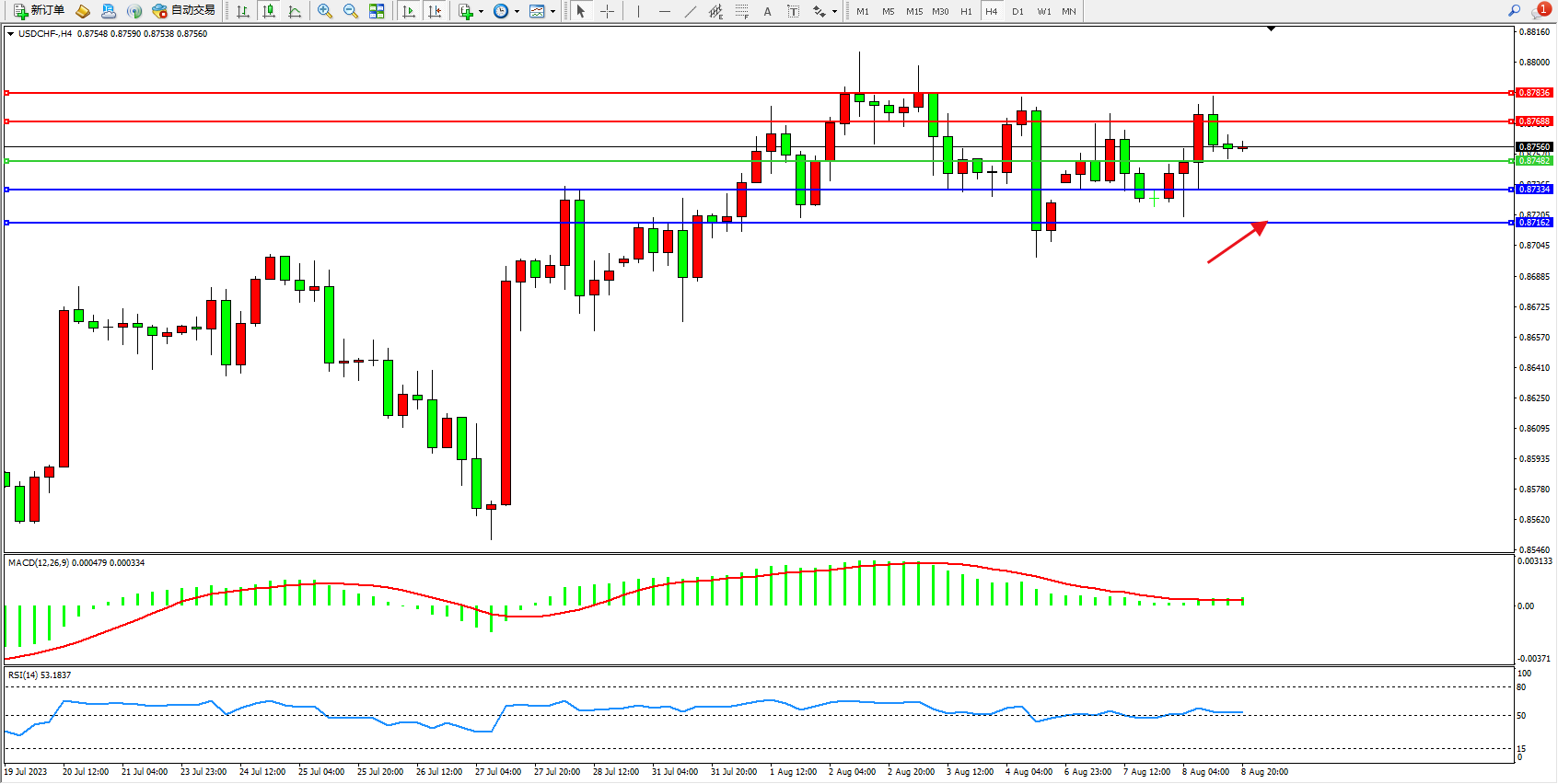 美元瑞郎USDCHF——4小时K线图显示: