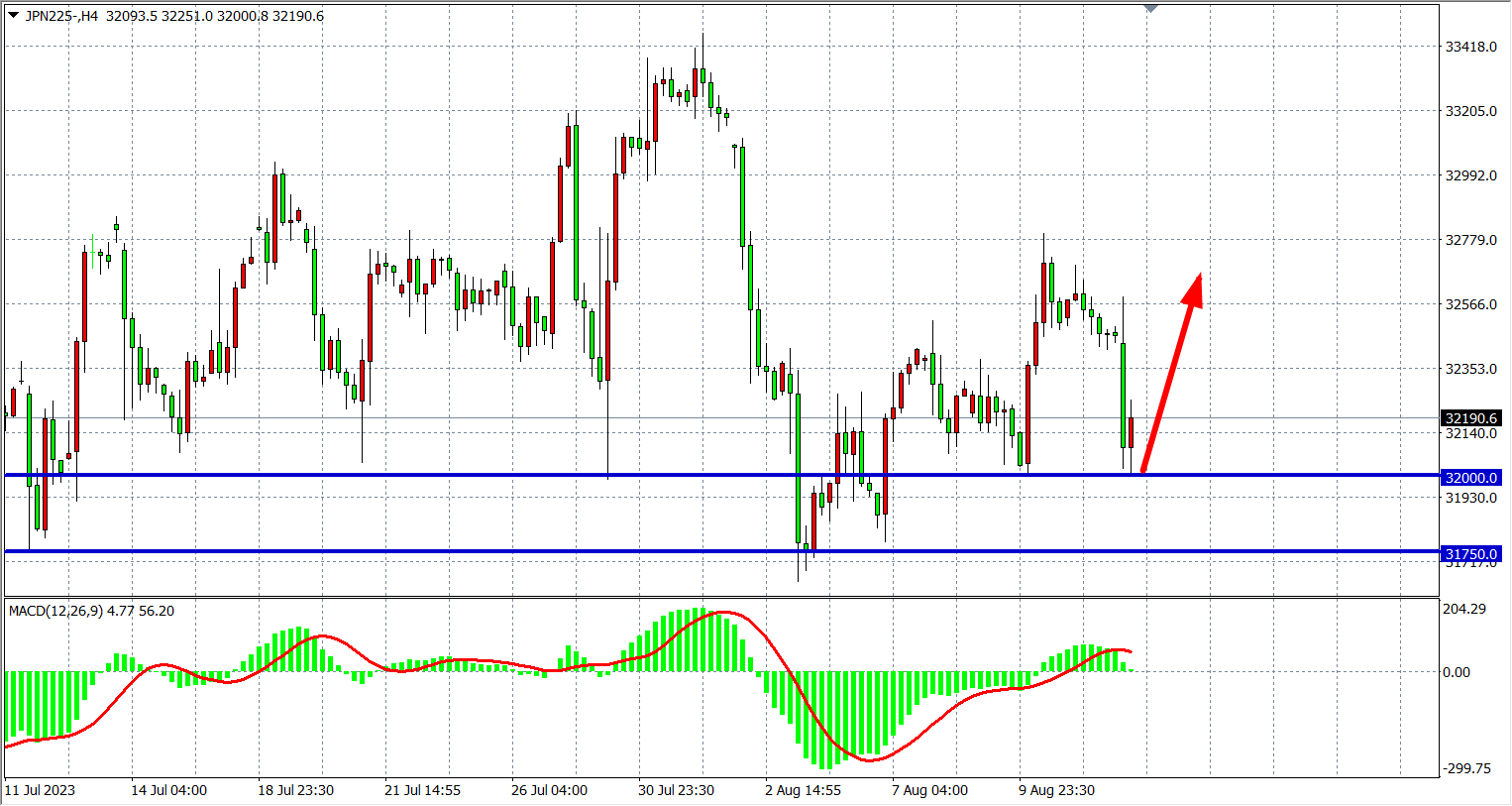 4小时图看,日经指数再度回落32000受支撑,MACD量能仔零轴上走缩,趋势仍有望走多头,支撑关注32000,阻力关注32750-33100。