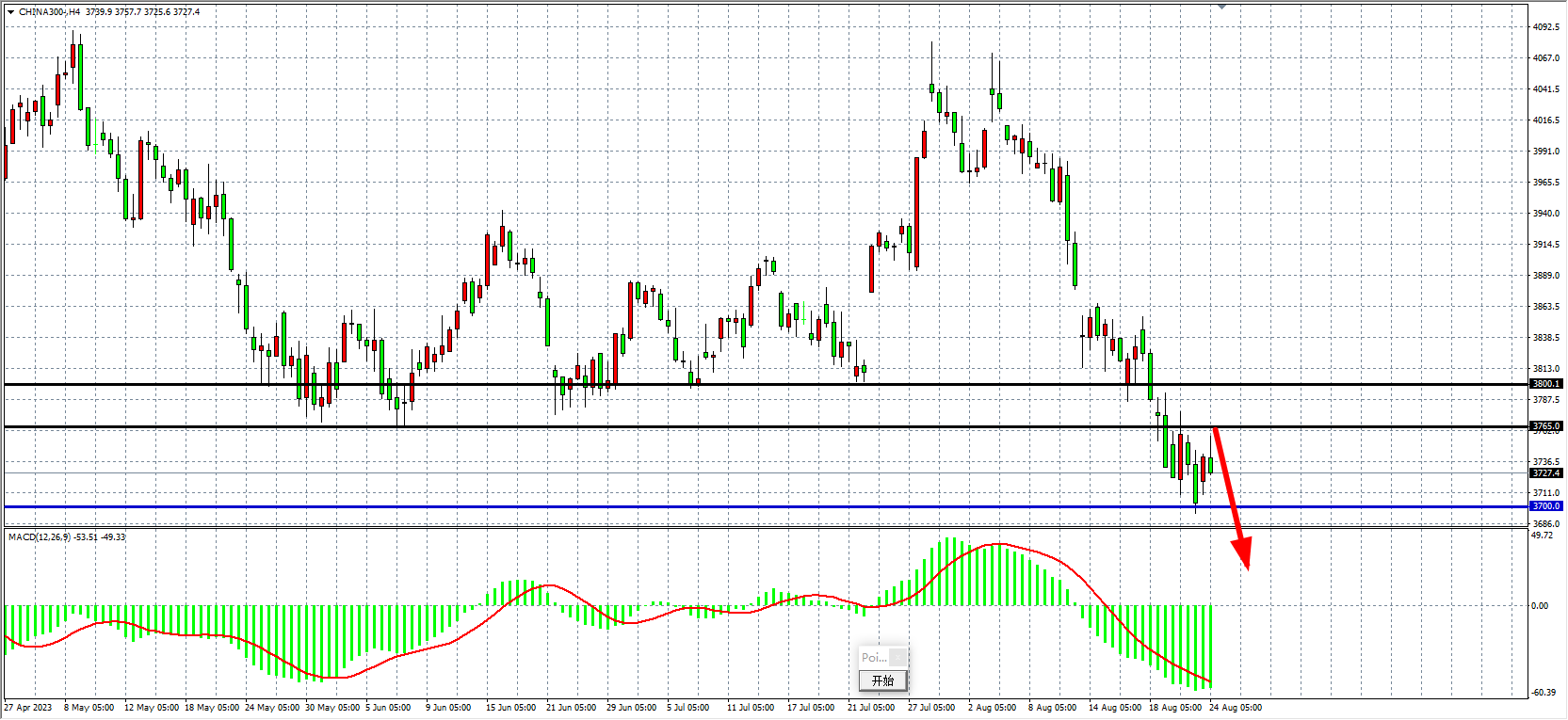 4小时图看,沪深300进一步跌至3700关口,MACD量能仍在零轴下放大,空头趋势延续,阻力关注3765-3800。