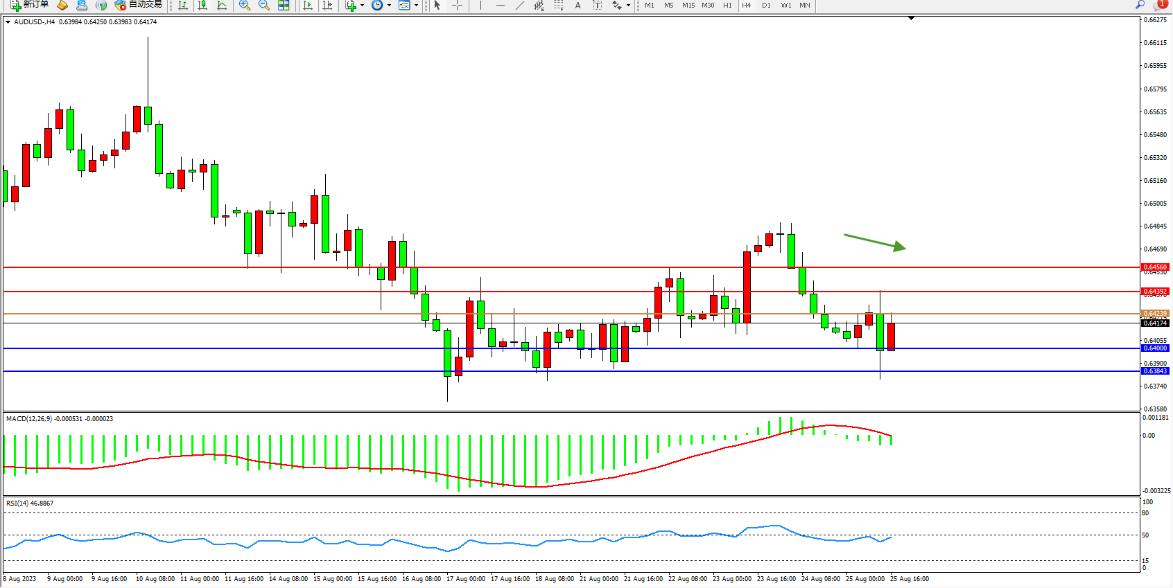 交易策略:0.64239下方看跌,目标0.64000 0.63843