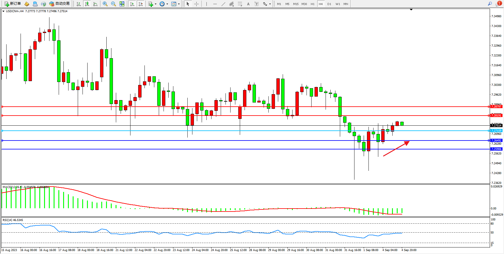 备选策略:7.27159下方看跌,目标7.26492  7.25906