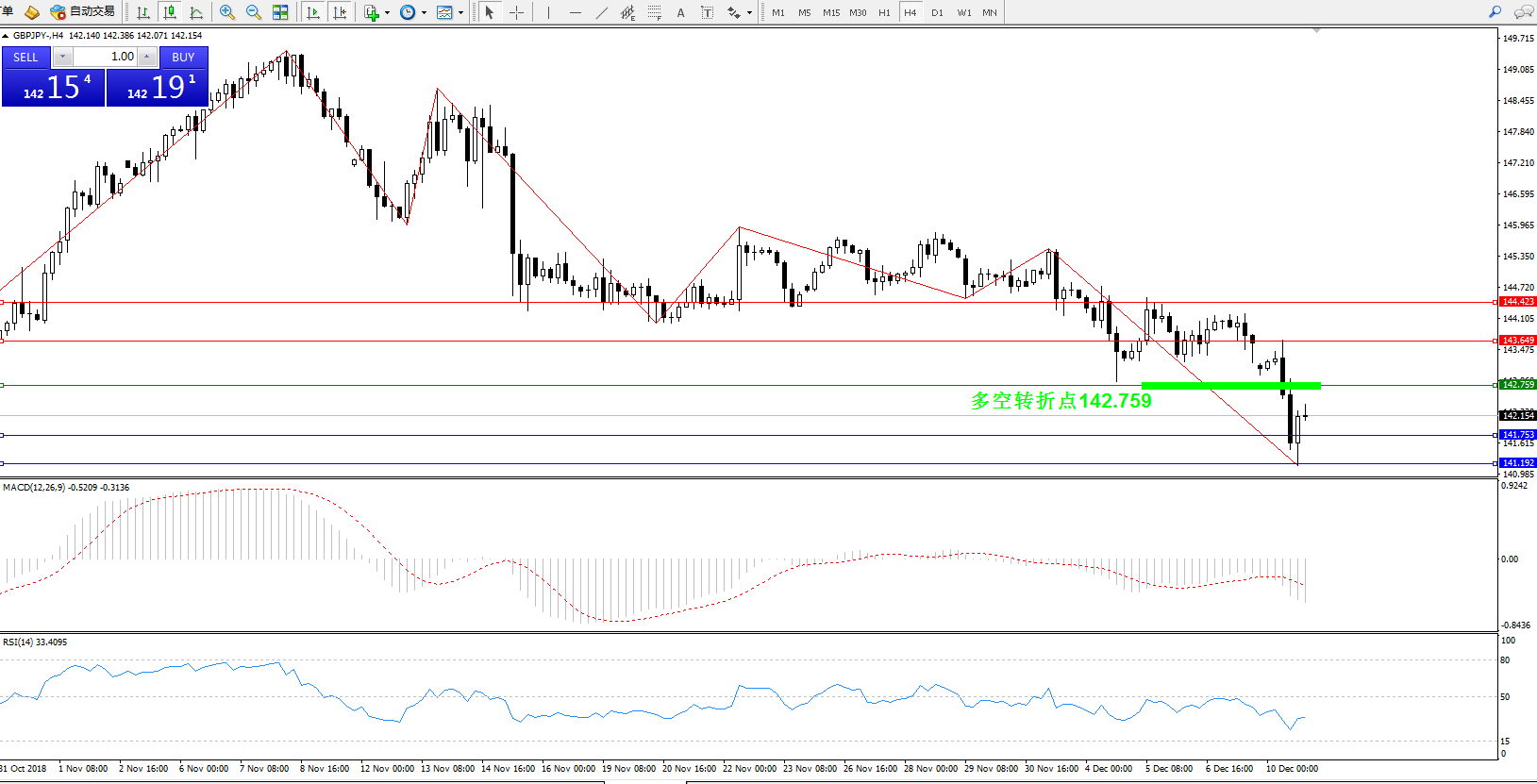 备选策略:142.759下方看跌,目标141.753141.192