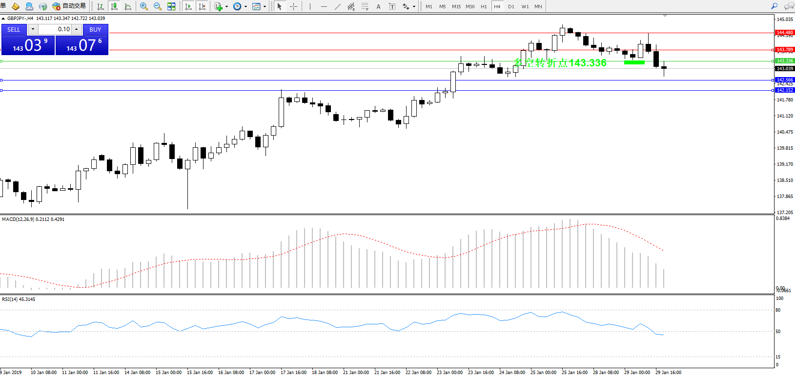 交易策略:143.336下方看跌,目标142.566、142.152