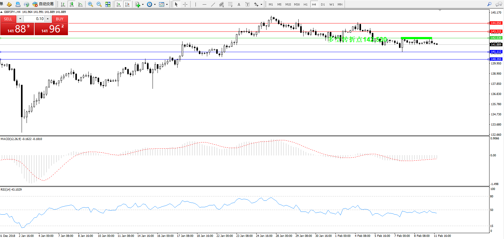 交易策略:142.530下方看跌,目标141.112、140.355