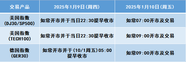 因应2025年1月9日(周四)为美国假期,本公司以下产品的交易时间将于假期期间作以下安排,敬请留意。