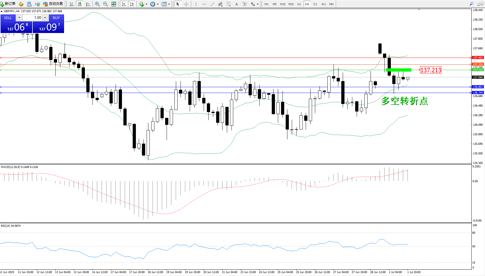 交易策略:137.213下方看跌,目标136.863、136.744