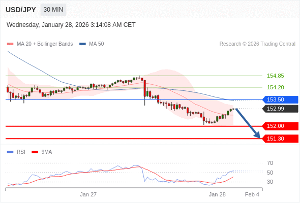 在 153.50 之下,看跌,目标价位为 152.00 ,然后为 151.30 。
