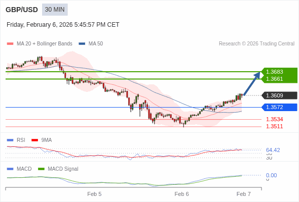 技术点评: RSI技术指标大于中性区域50。 MACD技术指标处在其信号线之上看多。 配置为正。 此外,价位高于其20天及50天移动平均线 ( 分别位于1.3585 和1.3560 )。