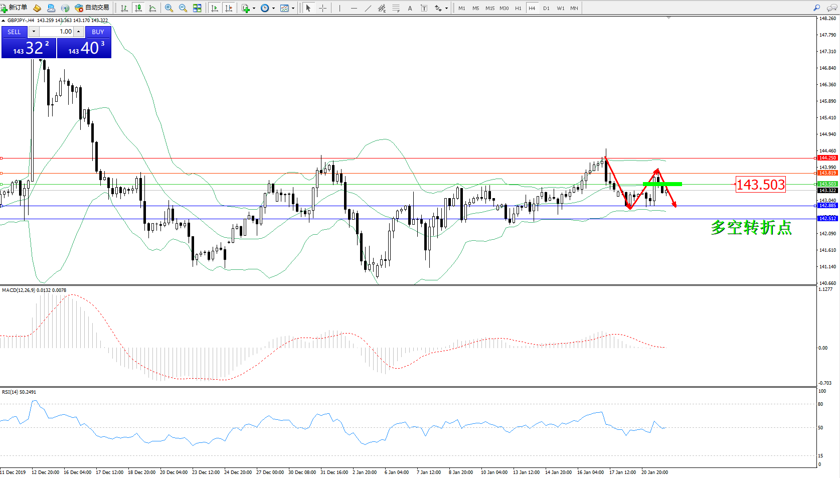 备选策略:143.503上方看涨,目标143.819,144.250