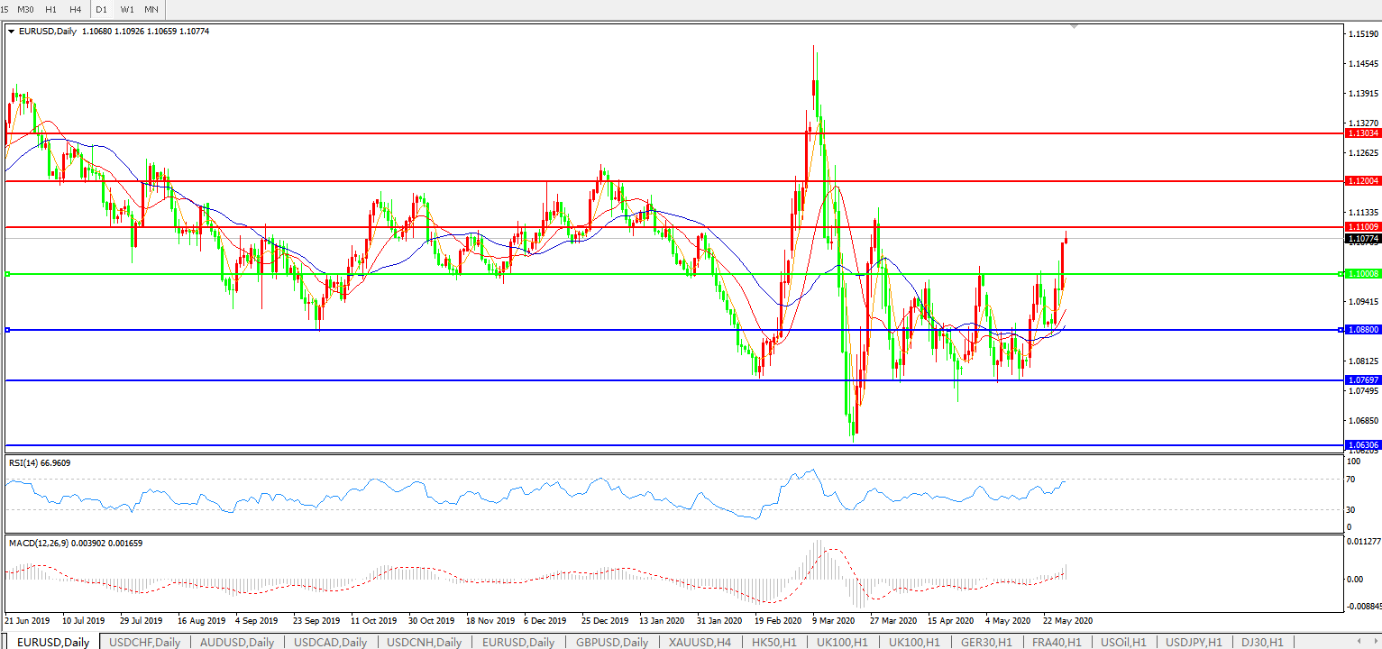 欧元兑美元周四上涨0.57%,至1.1066美元,为连续第三个交易日上涨,盘中创两个月新高至1.1093,因继续受到欧盟7,500亿欧元经济振兴计划的提振,目前市场风险偏好改善,令投资者青睐风险更高的资产。美元指数则一度创两个月新低至98.35;欧盟执委会周三公布了一项计划,以支持遭受新冠危机重创的经济体,希望结束数月来围绕如何为经济复苏提供资金的争论。Monex Europe外汇分析师Simon Harvey表示,欧元的价格走势继续受到全球风险情绪的推动,尽管市场参与者仍对欧盟复苏基金提案能否完整无损的获得批准深表怀疑。“预计欧元兑美元的波动率在未来几个月将保持良好支撑”隔夜隐含波动率指标小幅上升至8%以上的一个月高位,这表明投资者已经为欧元出现意外波动做好了准备。品浩(PIMCO)欧洲首席主权信用研究分析师Nicola Mai表示,“欧盟执委会的计划很好,但6月18-19日的领导人会议将是决定是否有推进该计划的政治意愿的关键。”