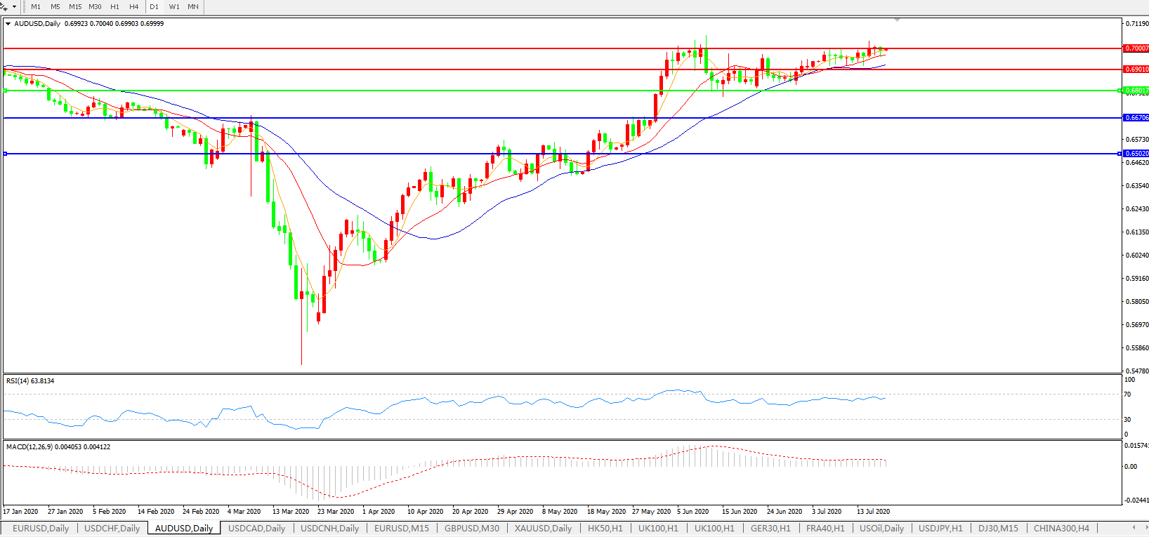 技术面简析:日图均线维持发散上行态势,汇价整理中呈强势,MACD运行于0轴上方但量能小幅缩量,RSI走平,预计汇价短线大概率将继续整理,关注0.7000 关口压制。