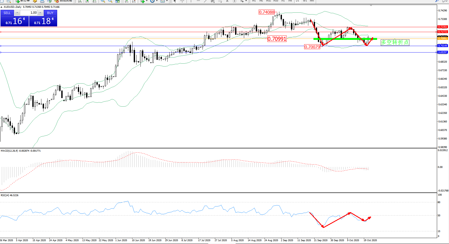 交易策略:0.70991上方看涨,目标0.71772、0.72351