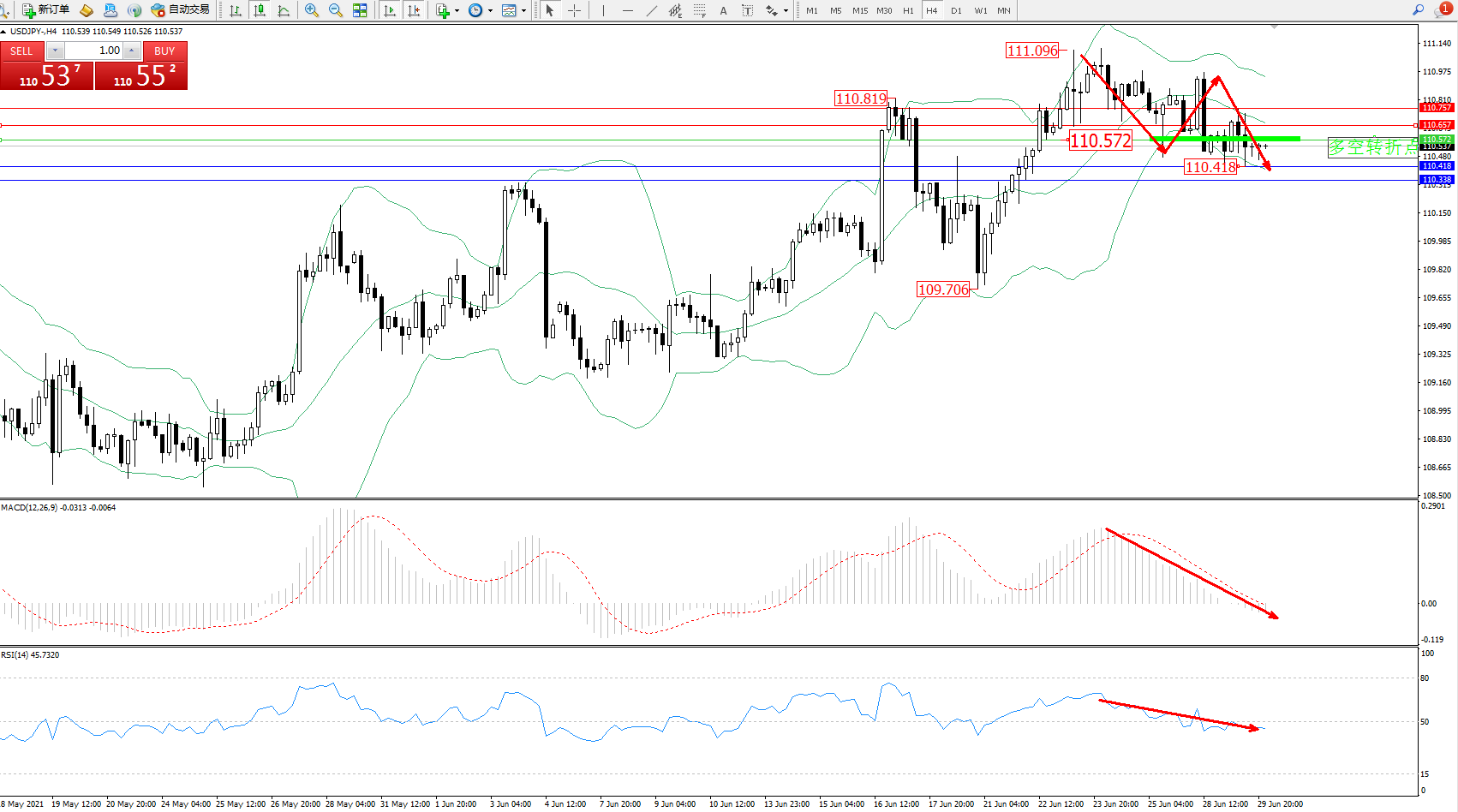 备选策略:110.572上方看涨,目标110.657、110.757