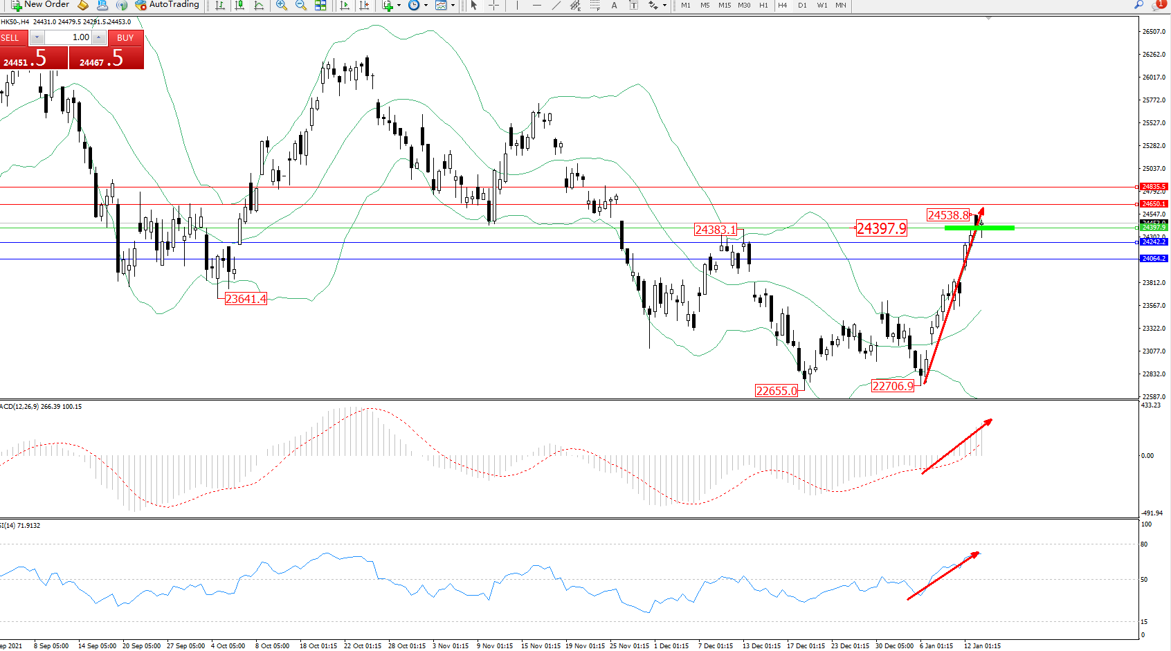 交易策略:24397上方看涨,目标24650、24835