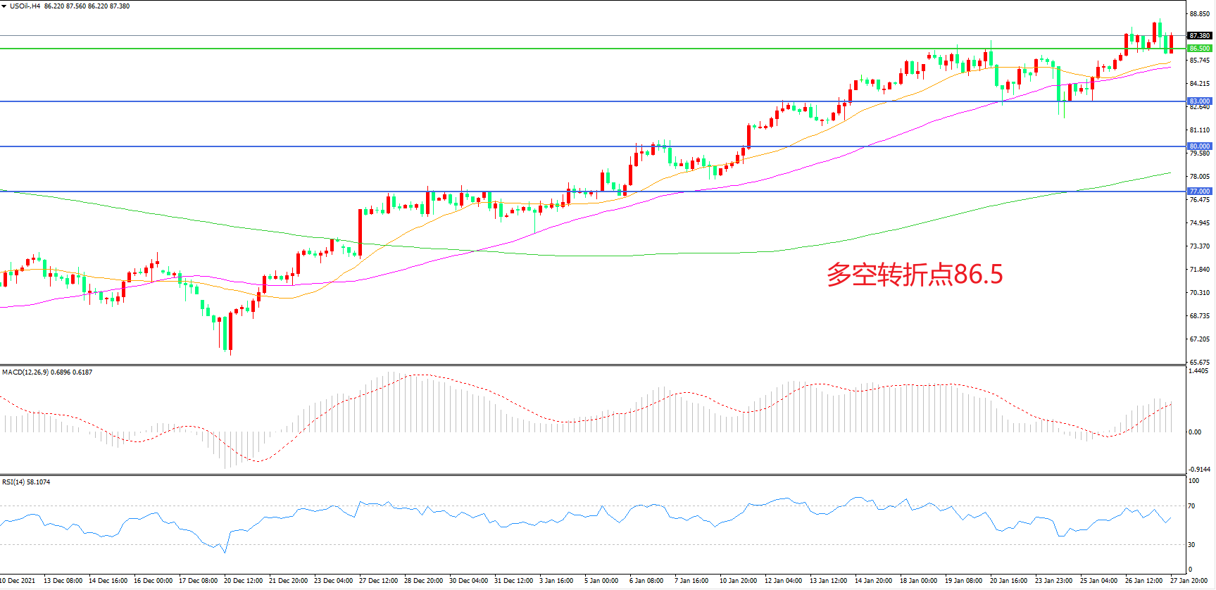 4小时图看,油价延续高位震荡走势,短期表现偏强,均线系统成为下方支撑,MACD红柱增加,RSI指标走平,日内震荡上行概率较大。