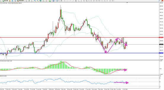 长时间维持在布林带指标通道内宽幅震荡,期间多次来回刺探上下轨区间节点,布林带指标呈收口走势后开始缓慢张口,上方压制关注1878附近,低位支撑关注1785附近,短期或维持通道内震荡,MACD指标处于0轴线下侧弱势平移,RSI指标处于50均衡线附近弱势窄幅整理中 ,如图: