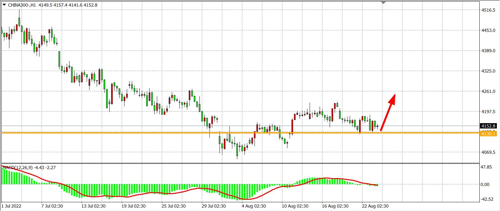 1小时图看,沪深300回调4130后出现止跌,目前该位成为当前短线支撑,MACD于零轴之上量能开始收缩,预示行情或延续调整,日内在4130之上继续看涨,上方目标4200-4250