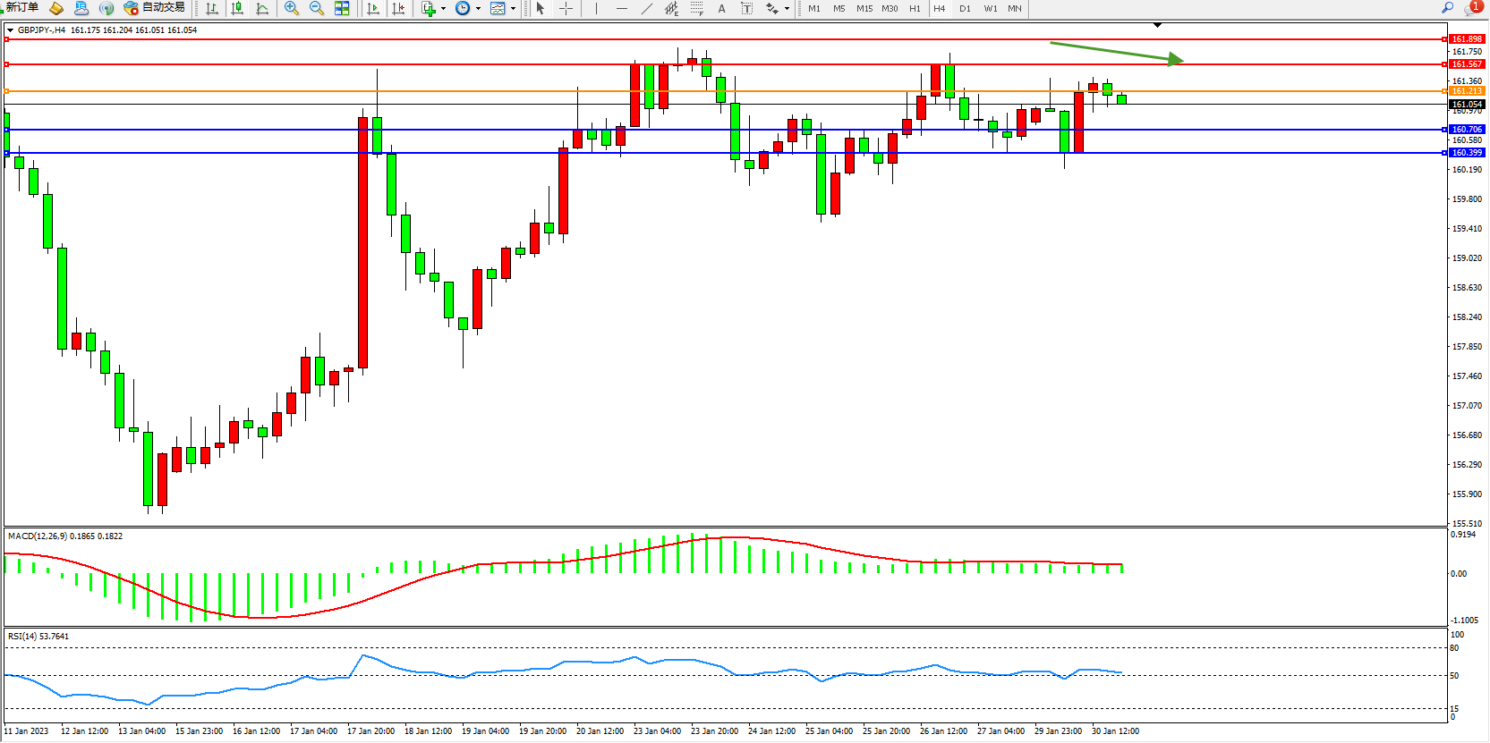 备选策略:161.213上方看涨,目标161.567、161.898