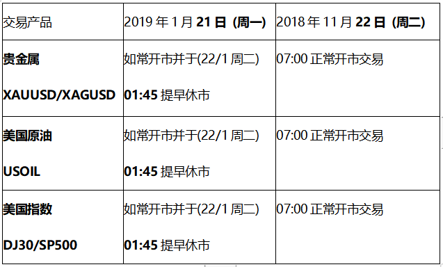 由于美国马丁路德金纪念日假期 (2019年1月21日周一),以下部分交易产品的交易时间将受美国假期休市影响,敬请阁下留意知悉!